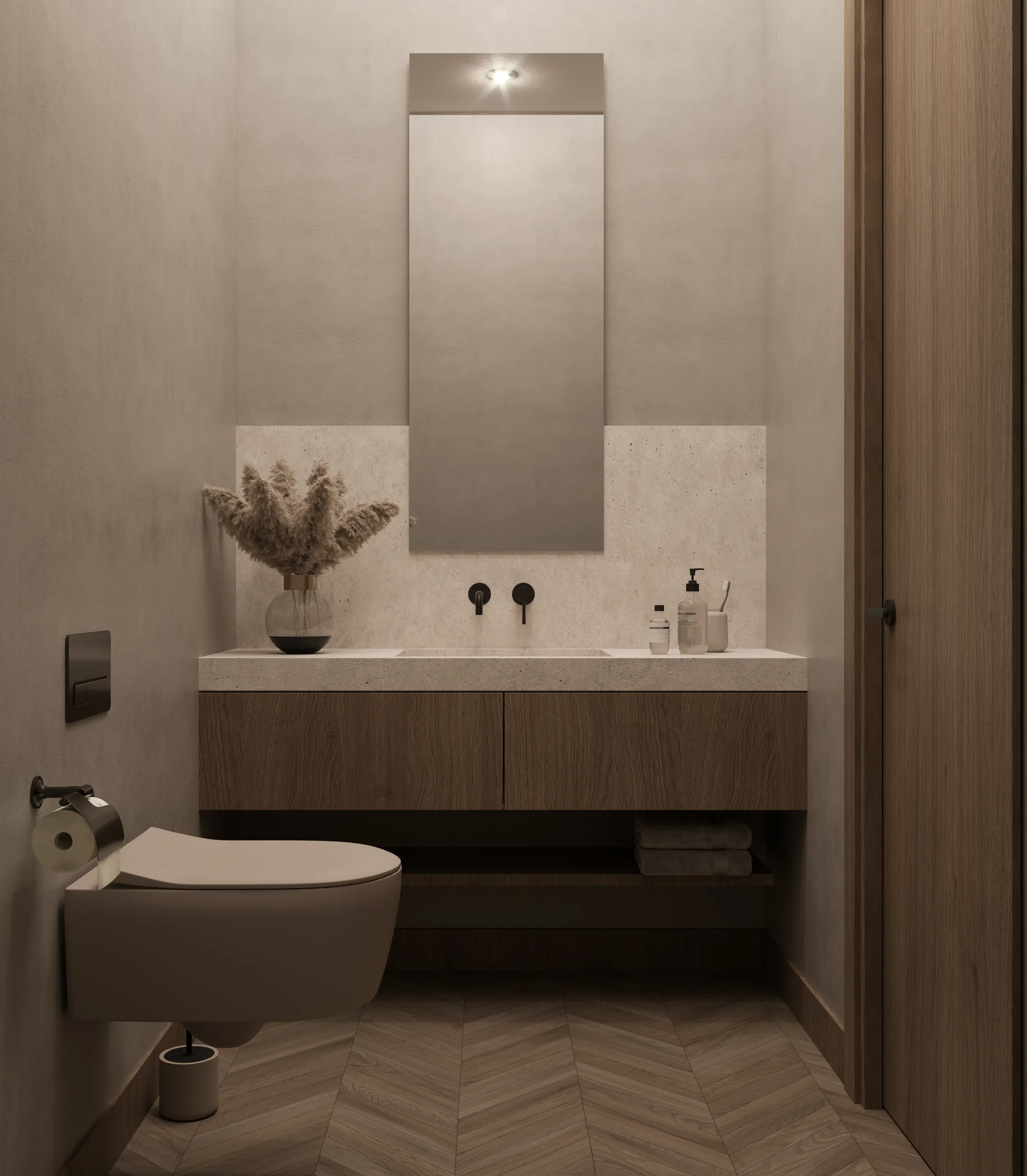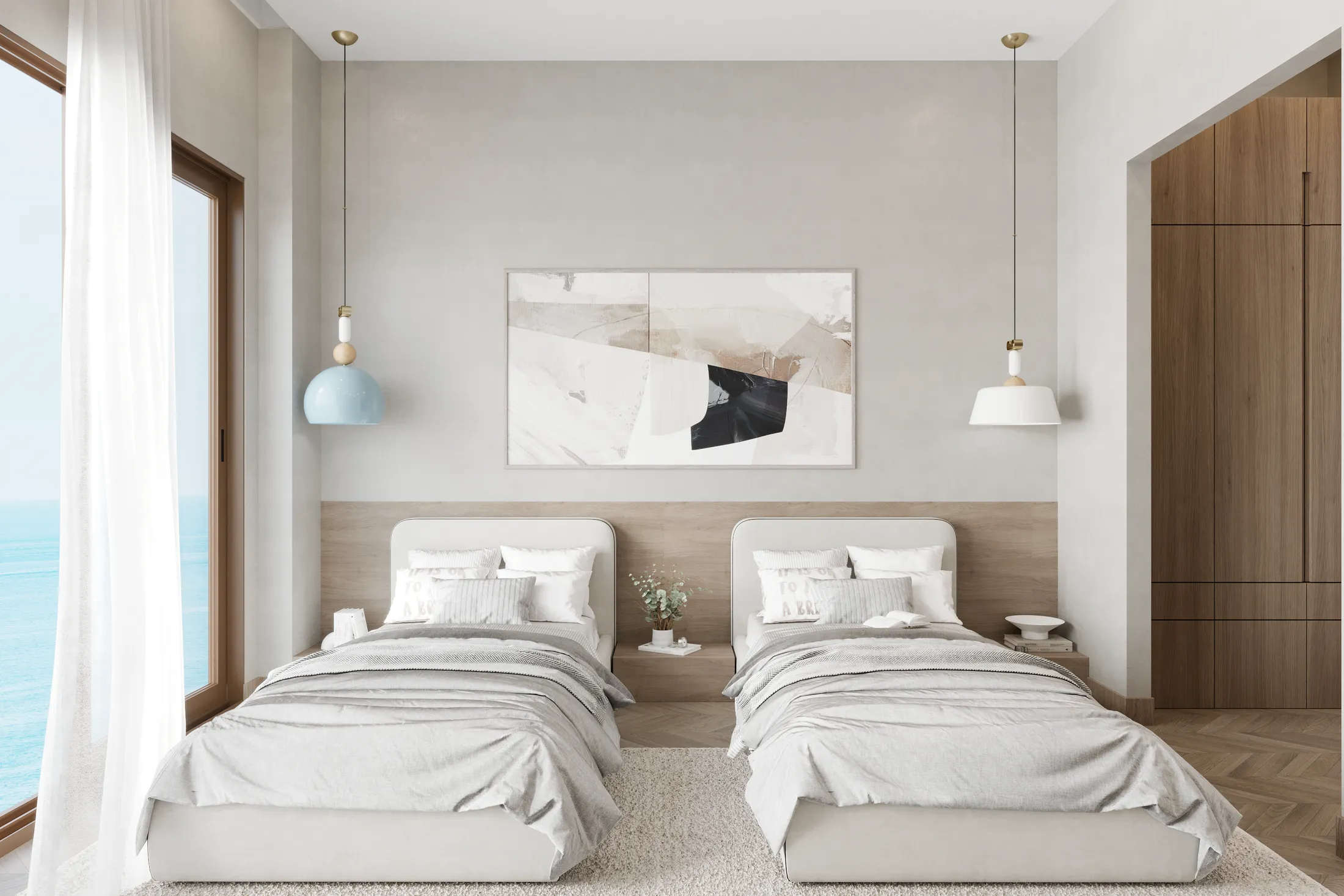 İki geniş yatak odası, büyük pencereleri ve modern tasarımıyla huzurlu bir ortam yaratırken, geniş dolap alanları sayesinde düzenli ve konforlu bir yaşam sunar. Şık banyo, lüks detayları, geniş duş alanı ve kaliteli seramikleriyle günün yorgunluğunu atabileceğiniz bir spa deneyimi sunuyor.