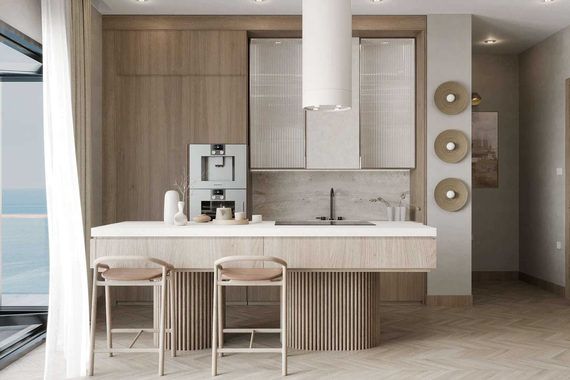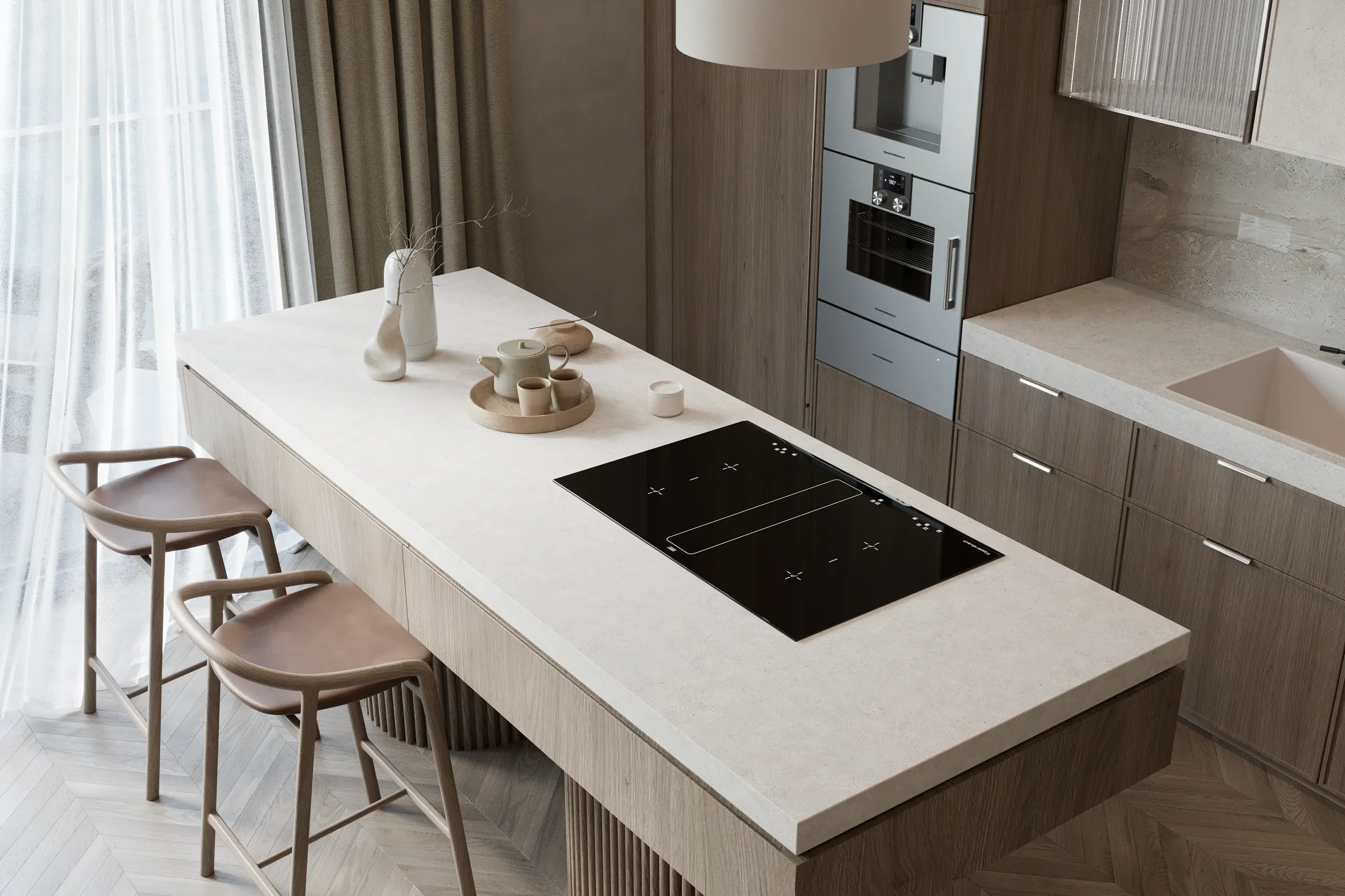 Mutfak, birinci sınıf ankastre cihazlarla donatılmış olup, geniş depolama alanı ve fonksiyonel bir ada tezgahıyla hem günlük kullanım hem de özel davetler için ideal bir alan sunuyor. Açık konsept oturma ve yemek alanı, sevdiklerinizle keyifli anlar yaşamanız için ferah ve konforlu bir atmosfer sağlıyor.