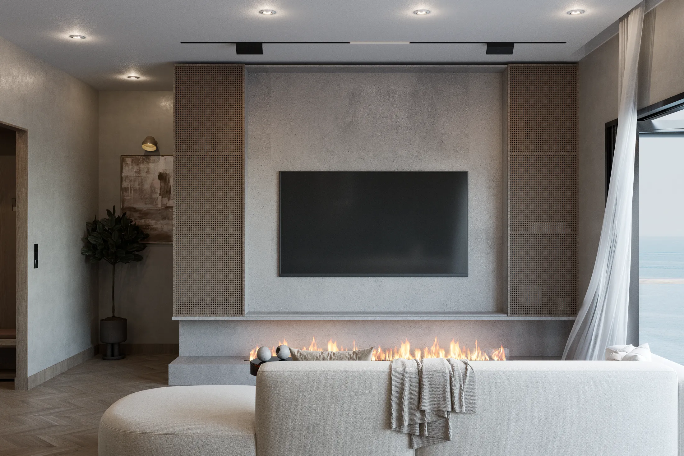 Dairenize adım attığınız anda, açık plan tasarımın sunduğu ferahlık ve zarafet hissini yaşayacaksınız. Geniş pencereler, yaşam alanınızı doğal ışıkla doldururken, tropikal bitki örtüsü ve muhteşem deniz manzarasıyla çevrili bir atmosfer yaratıyor.