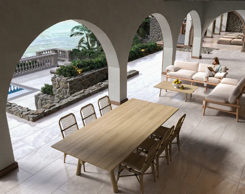 🔹 Zamansız Malzemeler, Eşsiz İşçilik – El işçiliğiyle oyulmuş ahşap kapılar, özel kesim doğal taş detaylar ve antik dokulu kemerler.